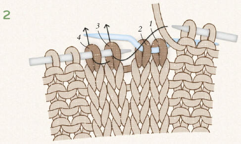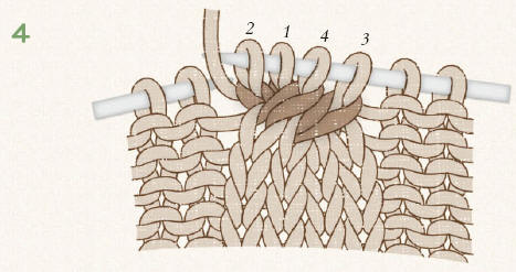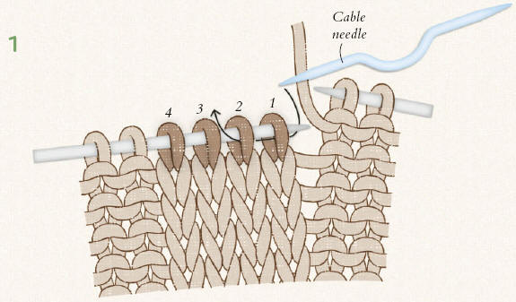Slip the next 2 stitches (stitches 1 and 2) to the cable needle, hold the cable needle to the back. |