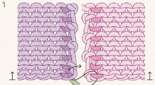 Reverse stockinette Pick up the crosswise yarn (see diagram) 1 stitch in from each edge of every row, alternately. |