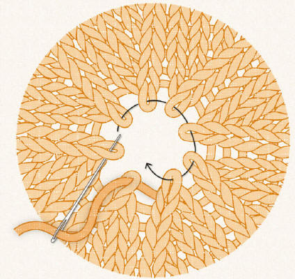 Thread the tail on a yarn needle, pass the yarn through all the stitches, and pull snugly to close the hole.