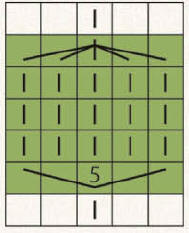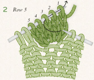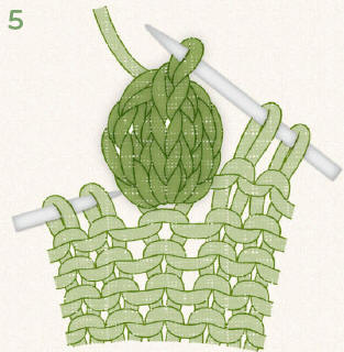 With purl-side facing, work 5 stitches (knit 1, yarn over, knit 1, yarn over, knit 1) in the next stitch. Turning after each row of 5 stitches, work in reverse stockinette for 4 rows. |