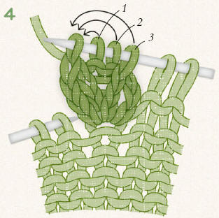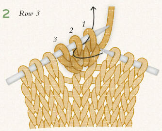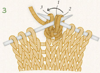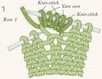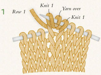 Work 3 stitches (knit 1, yarn over, knit 1) in next 1 stitch.