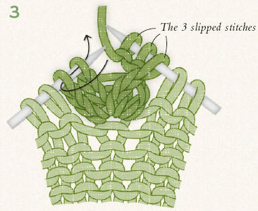 Pass the 3 slipped stitches, 1 at a time (in 1, 2, 3 order), over the knit stitch from Step 3. |