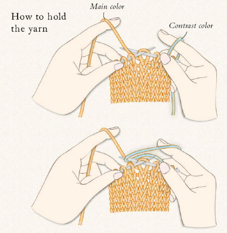 In order to work quickly, hold both yarn colors, one on the index finger of each hand. Hold the main color (the yarn to be used for the background) over the left index finger and the yarn for the contrast color over the right index finger.