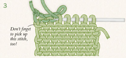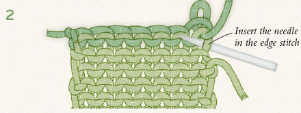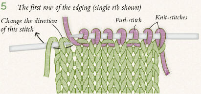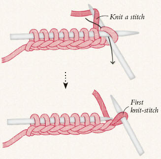 Turn the knitted fabric to the right side and work the first row. Knit the last stitch together with the yarn end as shown and the edge will be neatly finished. |