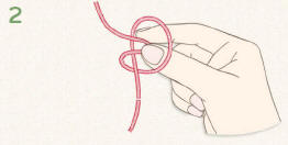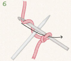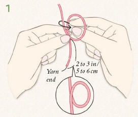Make a loop at a place 2 to 3 in/5 to 6 cm from the yarn end. Pinch the intersection of the loop with the fingers of your left hand, and from the other side of the loop, insert the fingers of your right hand into the middle of the loop. |