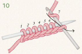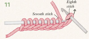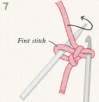For the last stitch (here, the eighth stitch), put the last loop pulled through by the hook onto the needle. This cast-on is not counted as a row! |