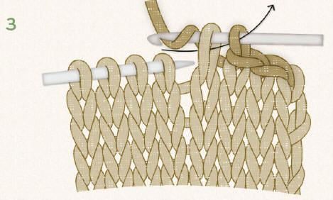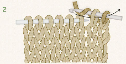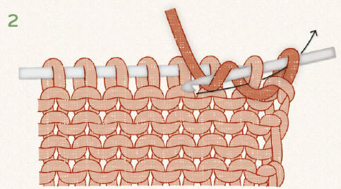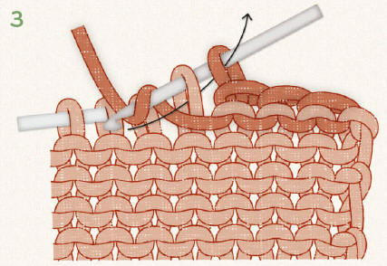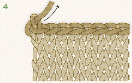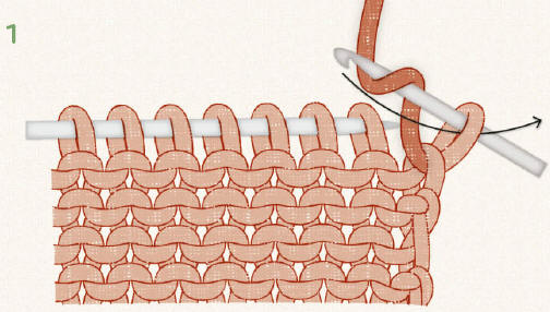 Insert the hook into the edge stitch as shown, taking the stitch off the needle, yarn over, and pull up a loop. |