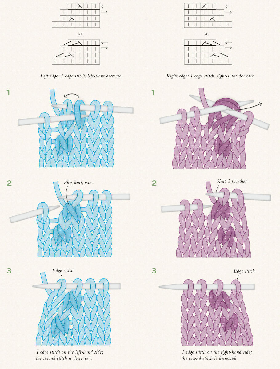 The edge stitch is difficult to stretch, making it ideal for seaming, and the position of the decreased stitch is not conspicuous. There are 2 ways to chart this method, but the knitting is the same.