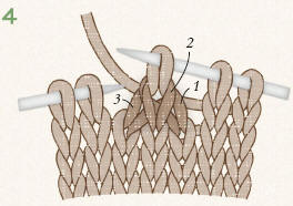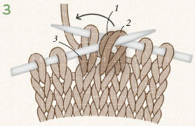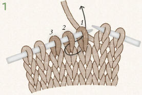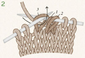 Insert the right-hand needle into the next 2 stitches (2 and 1), and slip them together to the right-hand needle, as shown by the arrow. |