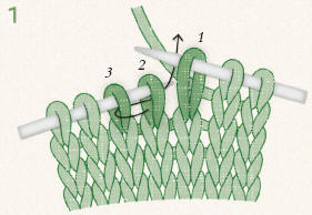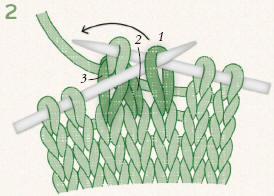 Insert the left-hand needle into the slipped stitch (1) and pass it over the knit stitch. |