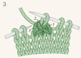 With right-side facing, slip the next stitch (1) knitwise to the right-hand needle; knit 2 together (2 and 3), stitch 3 is on top of stitch 2. |