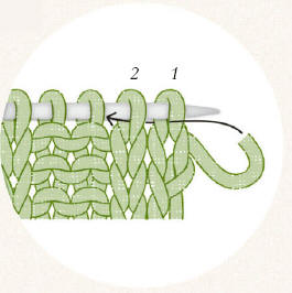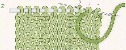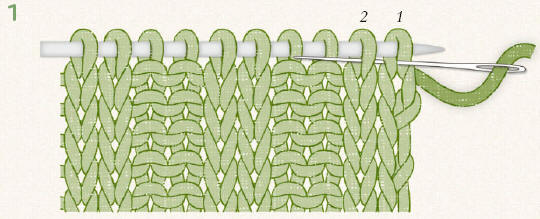 At the end of the row, insert the needle into the next-to-last stitch (from the front), and bring it out through the last stitch. Insert the needle from the back into the last purl-stitch (third stitch from the end) and bring it out through the last stitch. |