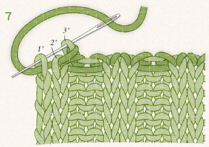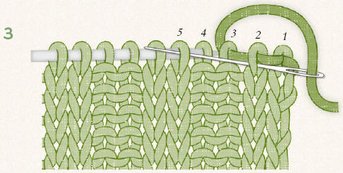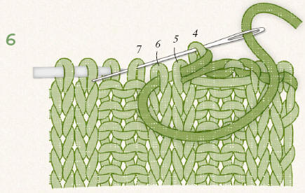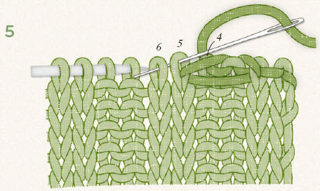 Insert the needle through stitches 5 and 6 as shown (from the front). |