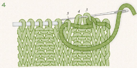 Return to stitch 2, insert the needle from the front, skip stitches 3 and 4 (purl-stitches), and bring the needle out at the front of stitch 5 (a knit-stitch). |