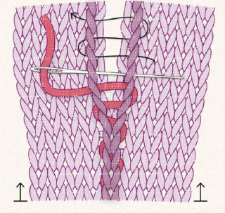 Going ahead 1 row, take out the needle at a straight angle. Go back 1 row, and ahead 1 row, as shown by the arrows. |