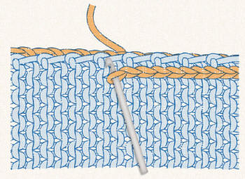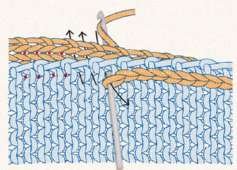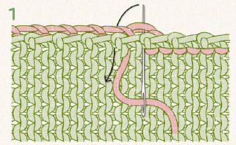 Crochet slip stitch This method is worked with the pieces held right-sides together, using a crochet hook and the basic crochet slip stitch. It produces a firm seam and prevents stretching, so it’s often used for joining sleeves at armholes. This method is also suitable for mohair and less stable, textured yarns. |