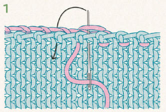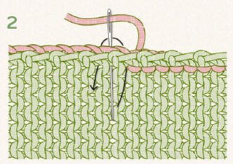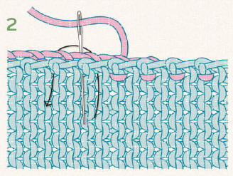 Insert the needle at a straight angle into the knitted fabric between stitch 1 and stitch 2. |