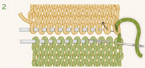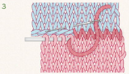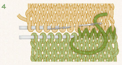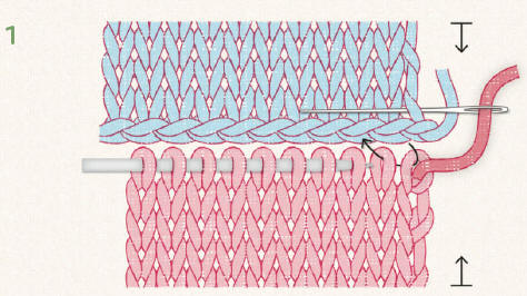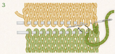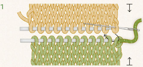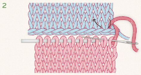 This is a method for joining 2 pieces, worked in stockinette stitch, using a yarn needle. The grafting forms a new row. Prepare a length of yarn about 3 times the width of the pieces. With the right side of both pieces facing and arranged as shown, begin grafting at the right-hand edge. Be sure to adjust your tension as you work, so that the Kitchener stitch is the same gauge as the pieces being joined.