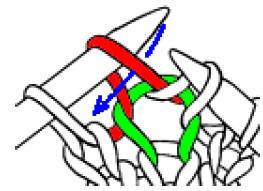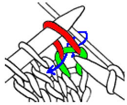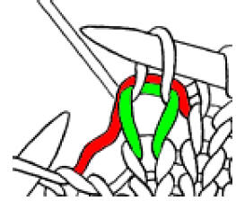 Insert the right needle into the stitch(green) below the first stitch on the left needle. |
