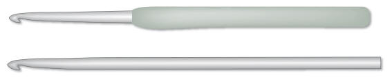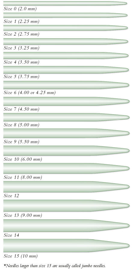 These are used to cast on, for crochet slip-stitch bind-off, for grafting, and for seaming. Hook sizes are generally given in letter and metric, from B (2.25 mm) to S (19 mm).
