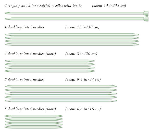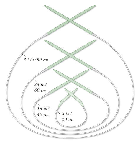 Used when working a project in the round. Shorter lengths are used for small items such as hats or for working trim around a neckline. Longer lengths are used for circular garments, as well as garments worked in 1 piece to the underarm, then split for the armholes, or any item with a large number of stitches. The nylon cords vary in length. The needle tips are available in the same sizes and materials as other knitting needles.