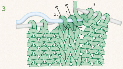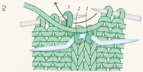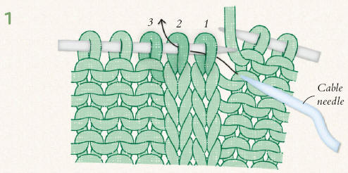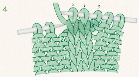 Slip the next 2 stitches (1 and 2) to the cable needle, hold the cable needle to the front. |