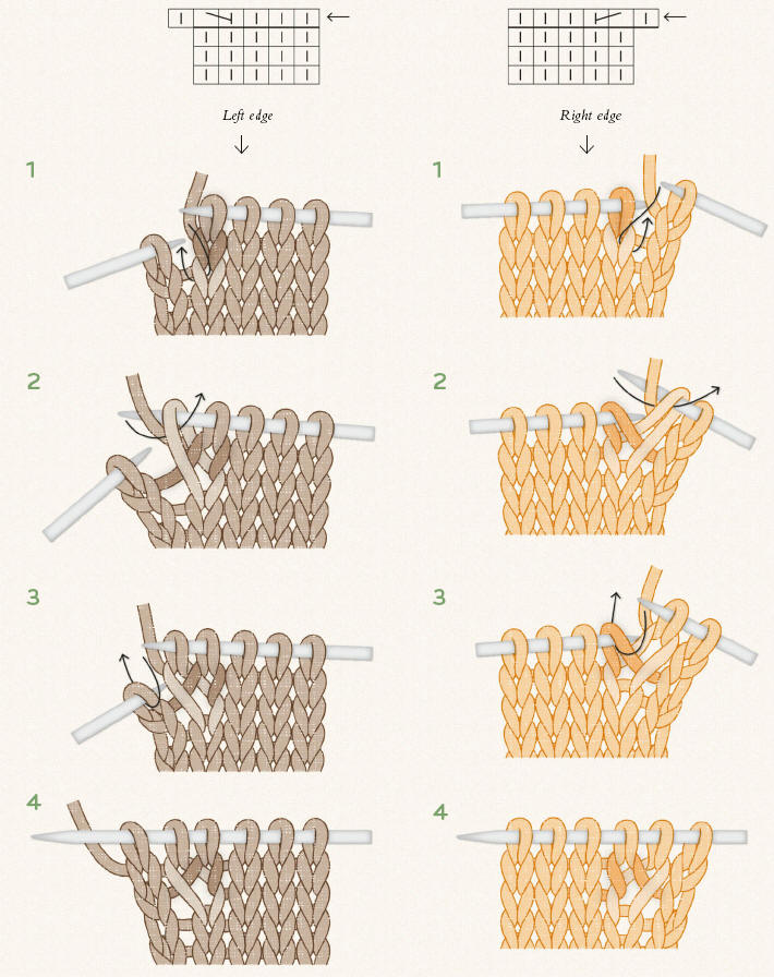 A single increase worked by lifting a stitch from the row below; shown in stockinette stitch. The increase is worked 1 stitch in from the edge. This technique is best used when there are several rows between the increase rows.