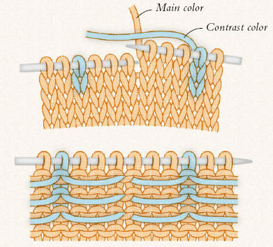 When the yarn being carried loosely across has long f loats, it can be easily caught by fingers and pulled out of shape, so wrap the strands into a stitch at various points.