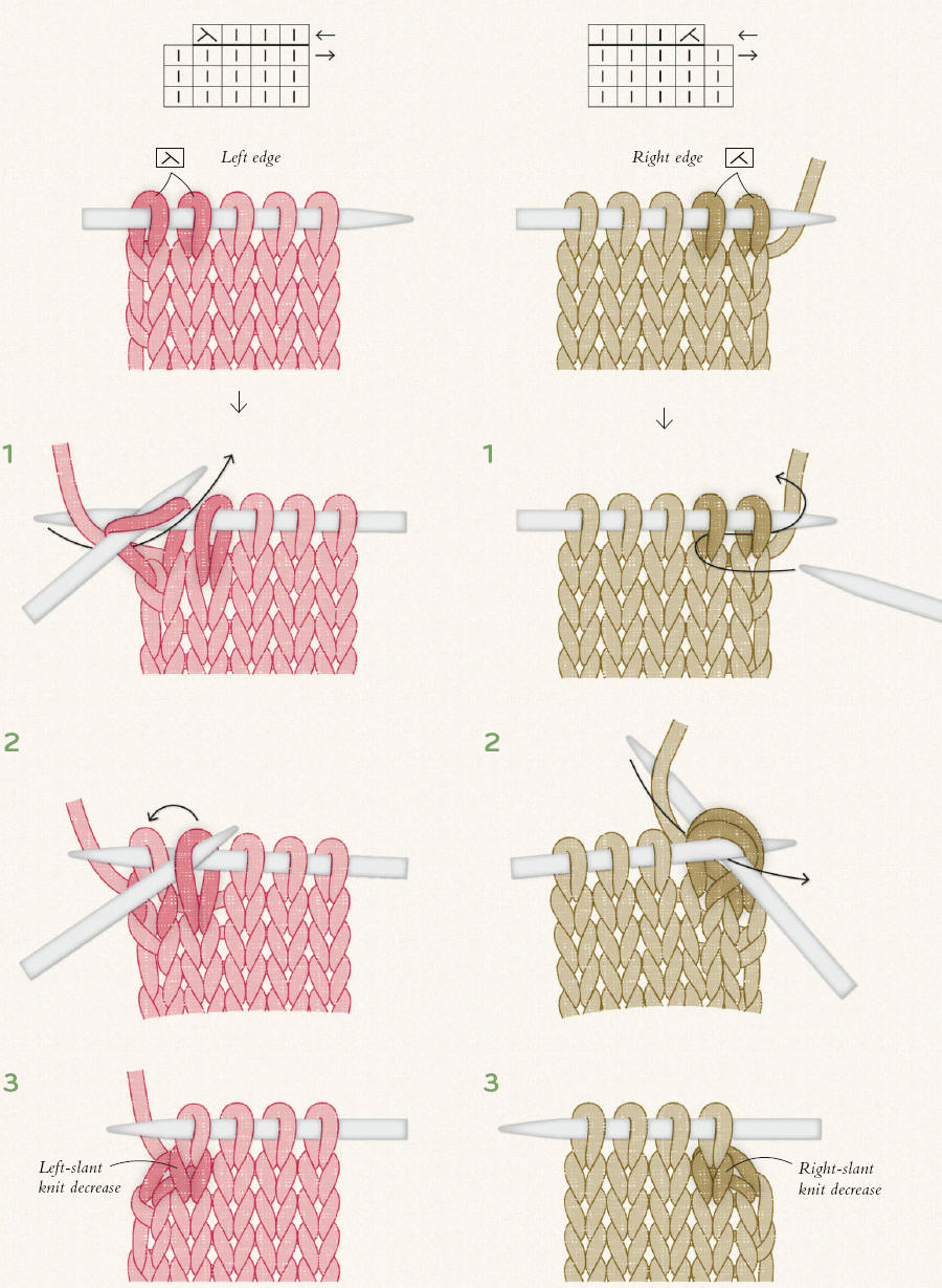DECREASING KNIT-STITCHES: At the right-hand edge, work a right-slanting knit decrease; at the left-hand edge, work a left-slanting knit decrease.