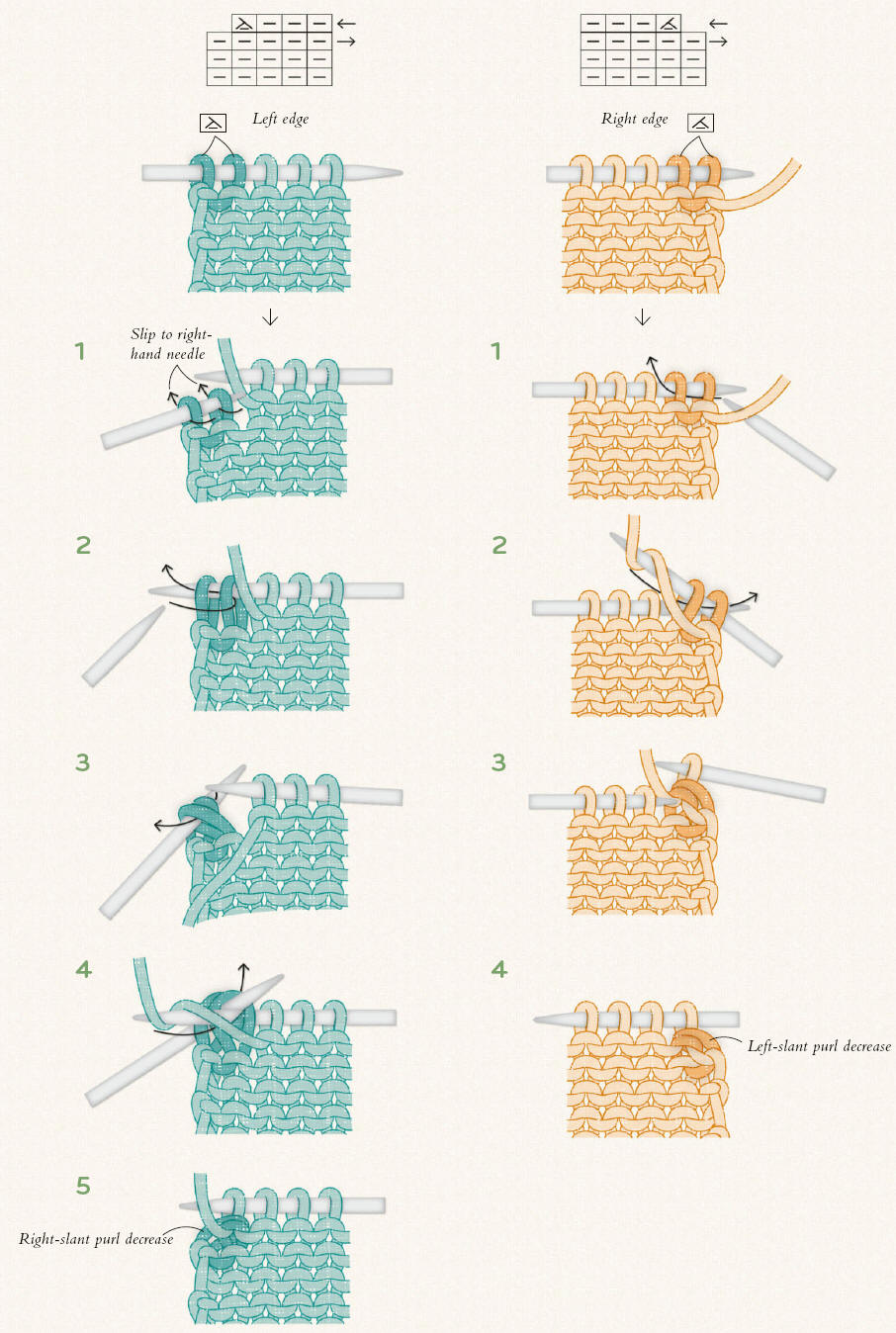 DECREASING PURL-STITCHES: At the right-hand edge, work a left-slanting purl decrease; at the left-hand edge, work a right-slanting purl decrease.