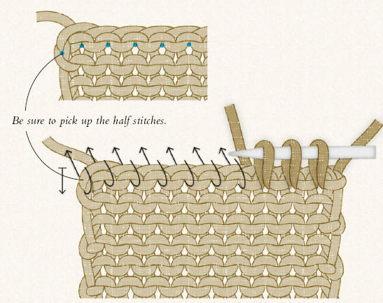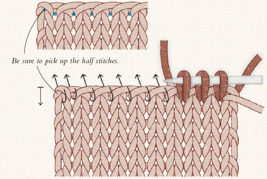 Picking up stitches from stitches This is a way of picking up stitches from a long-tail cast-on or a bound-off edge. Hold the piece with the right-side facing and the edge to be picked up at the top. Note: Pick up the half stitches at the edges. |