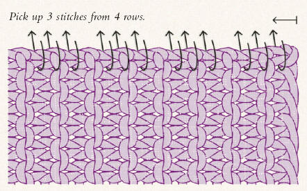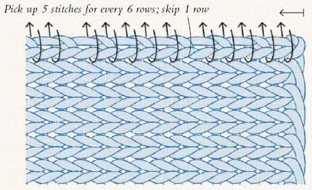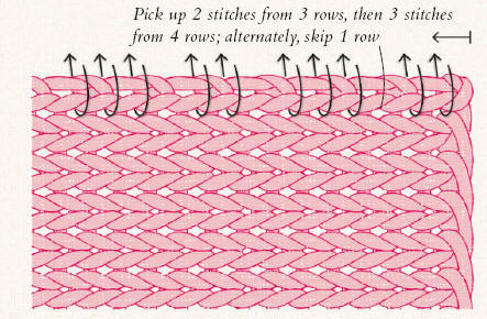 Picking up stitches from rows Remember: The row gauge is generally different than the stitch gauge (usually more rows per in/cm than stitches), so picking up on row ends means skipping a row at regular intervals. The ratio of skipped stitches varies with the gauge of the fabric, but will generally be 2 or 3 stitches per 3 or 4 rows. |