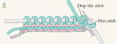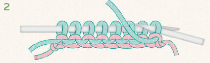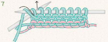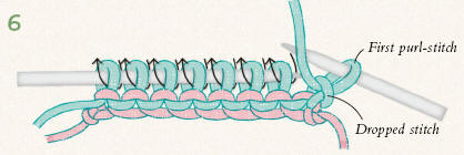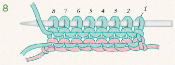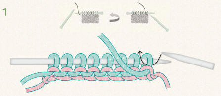 Turn over the fabric begun on the facing page and hold it in your left hand; place the main yarn in front of the knitting needle. Insert the right-hand needle into the first stitch from back to front (see arrow). |