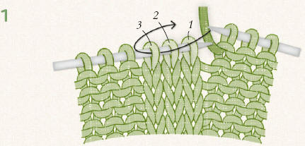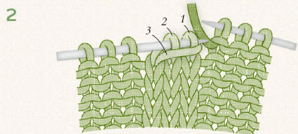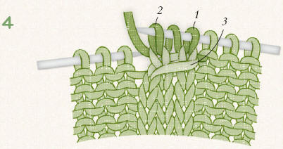 Insert the right-hand needle into stitch 3 on the left-hand needle, pass it over stitches 2 and 1. |