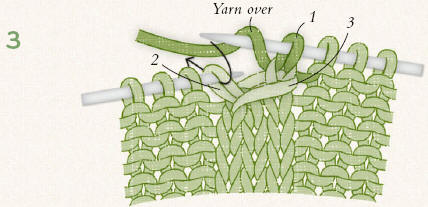 Knit 1 (1), yarn over, knit 1 (2). The yarn over returns the stitch count to the original 3 stitches. |