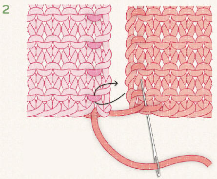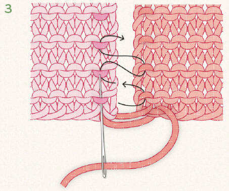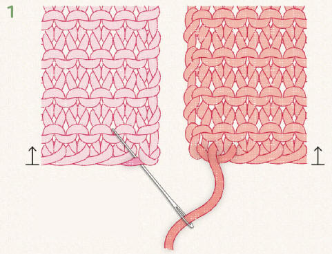 Garter stitch has a tendency to contract lengthwise, so if it is seamed 1 row at a time, the seam will stretch easily. A better way to work this seam is to pick up the yarn at intervals of every other row, 1 stitch in on 1 side, and 1 half stitch in on the other side.