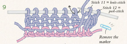 Purl. When working the first stitch, place a marker on the yarn (see illustration). Purl as usual for stockinette stitch. |