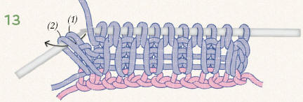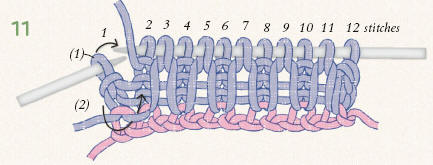 Repeat steps 9 and 10 across to the last stitch; move the last stitch to the right-hand needle (1). Use the left-hand needle to place the last purl bump from Row 1 onto the right-hand needle (2). |