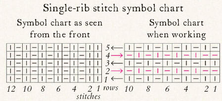 Alternate knit-stitches and purl-stitches lengthwise. When working in rows, the wrong side shows the stitches are reversed. Single-rib fabric stretches widthwise, and because the edges are stable, it’s a very useful fabric for edges of garments. When working in single rib, cast on in pattern (the stitches are rib stitches from the beginning).