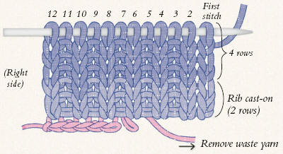 Remove the waste yarn after working 4 or 5 rows of single rib. |