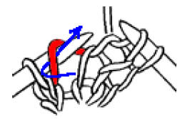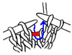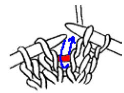 Insert the right needle in the strand on the left needle, like the blue arrow, and knit one stitch on it. |