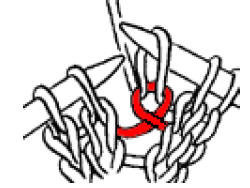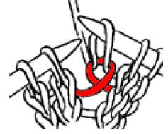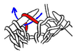 With the left needle, hook up the strand between the stitches,from front to back. |