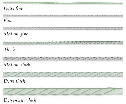 The diameter (thickness) of the yarn varies from the thinnest (extra fine or cobweb), for lacy items, to extra-extra thick (super bulky) for warm outer garments and rugs. The most common yarns for garments are DK, sport, and worsted.