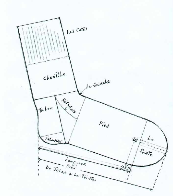 Tricoter en rond, le début des ronds sont à la ligne médiane arrière de la chaussette qui court sur le mollet.