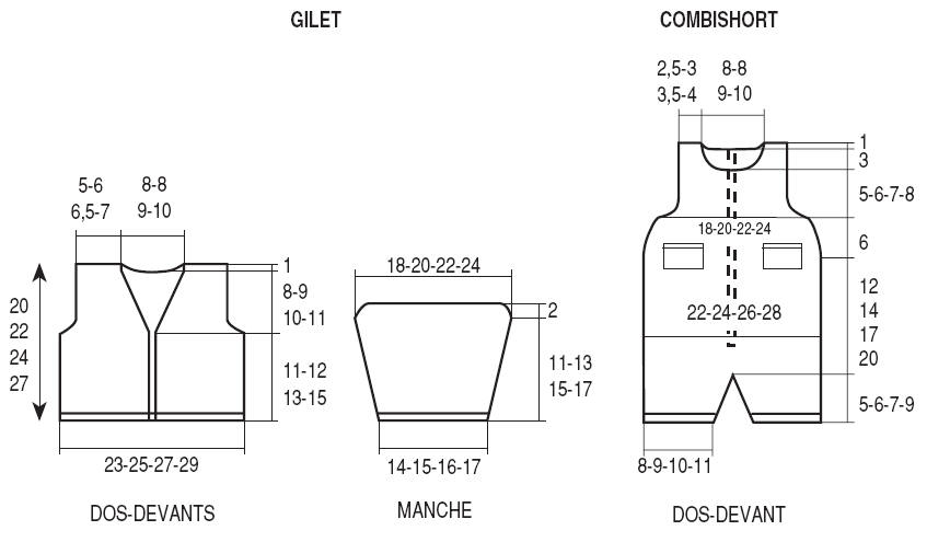 A 11-12-13-15 cm (46-50-56-64 rgs) de haut. tot., rab. de ch. côté tous les 2 rgs 1 fs 3 m., 1 fs 2 m., 3 fs 1 m. Il reste 58-64-70-76 m.