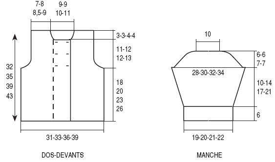 A 11-12-12-13 cm de haut. d’emmanchure (56-62-68-76 rgs de haut. tot.), rab. à gauche tous les 2 rgs 1 fois 7-7-8-9 m., 2 fois 1 m.