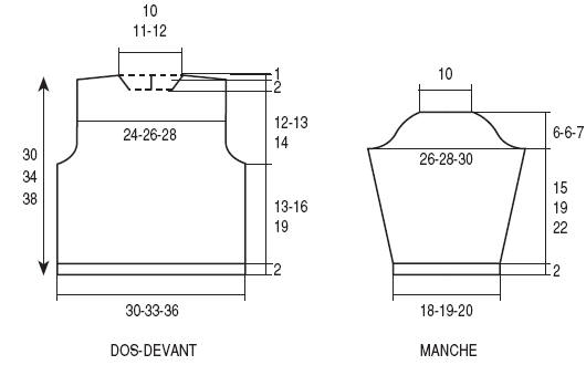 A 14-15-16 cm de haut. d’emmanchures (76-86-96 rgs de haut. tot), rab. de ch. côté tous les 2 rgs :