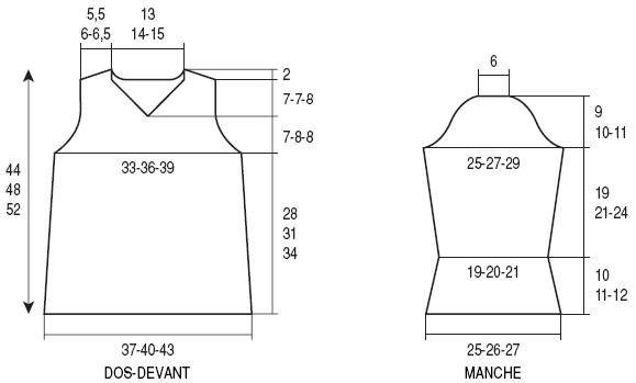 A 14-15-16 cm de haut. d’emmanchures (134-146- 158 rgs de haut. tot.), rab. de ch. côté tous les 2 rgs :