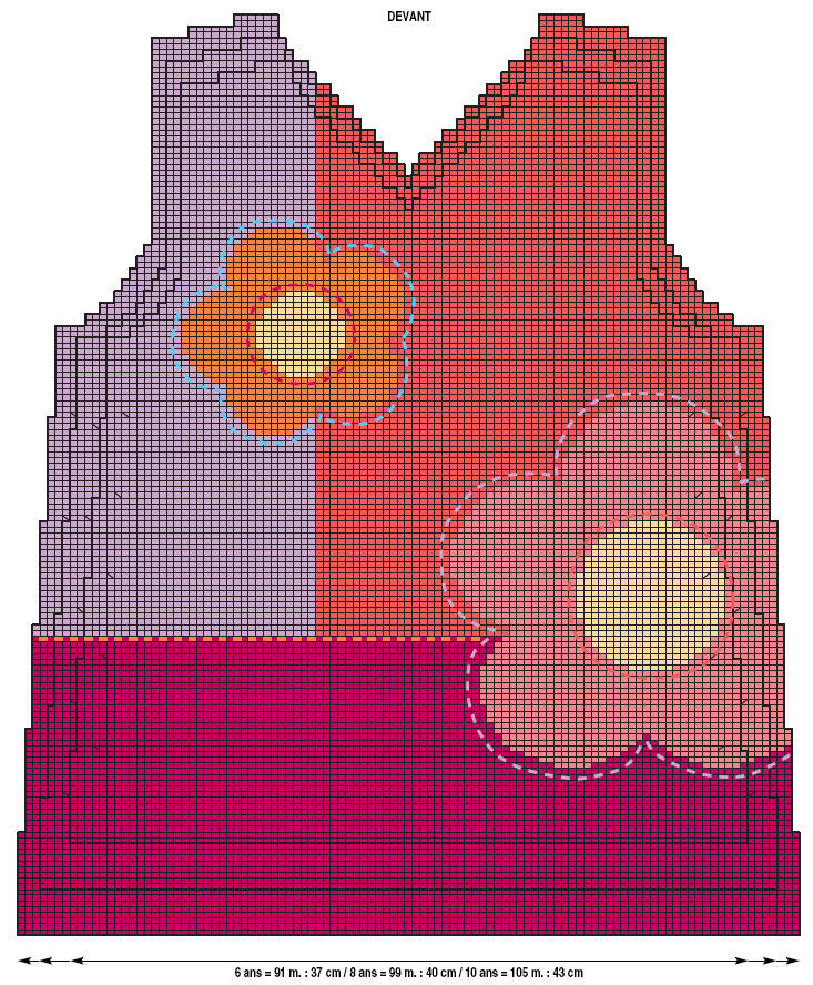 6 ans : 2 fois 1 m. tous les 16 rgs, 3 fois 1 m. tous les 14 rgs.
