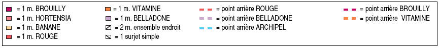 * 2 rgs Hortensia, 2 rgs Archipel, 4 rgs Brouilly, 4 rgs Rouge, 2 rgs Vitamine, 2 rgs Belladone, 4 rgs Brouilly, 4 rgs Rouge *, répéter de * à *.